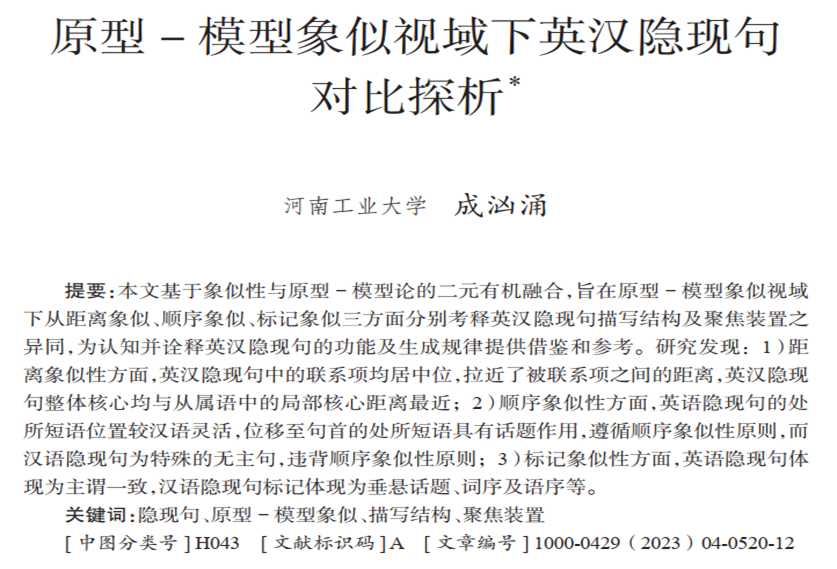 成汹涌教授在A类权威期刊《外语教学与研究》2023年第4期发表题为《原型—模型象似视域下英汉隐现句对比分析》的文章,这是性巴克