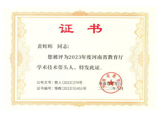 院长黄辉辉教授荣获“河南省教育厅学术技术带头人”称号。