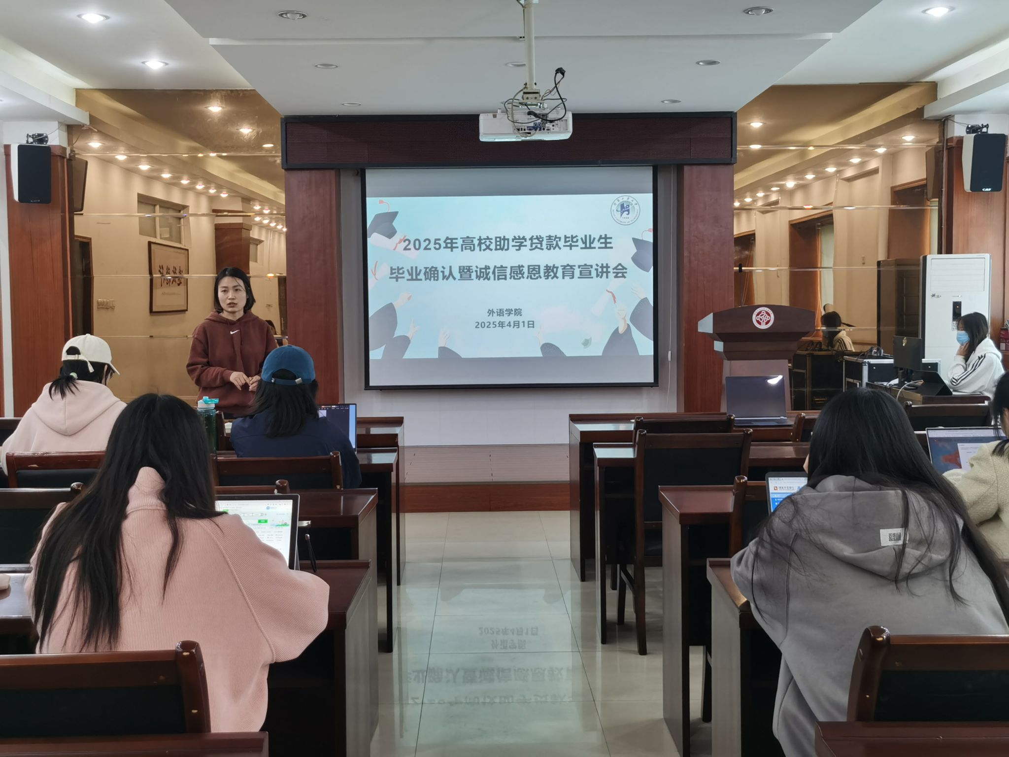 于4月1日在博闻楼5225会议室分别召开了2025年高校助学贷款和生源地助学贷款毕业生毕业确认暨诚信感恩教育宣讲会。学院学生资助工作负责人郭珊珊、学生助理及全体2025届国家助学贷款毕业生参加了会议。