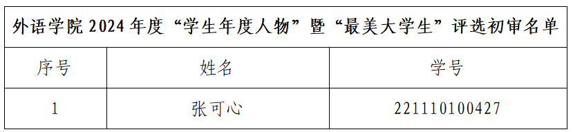 根据性巴克 关于开展2024年度“学生年度人物”暨“最美大学生”评选活动的通知要求,外语学院对符合评审条件的学生进行了评定与审核,学院共推荐1名学生申请2024年度“学生年度人物”暨“最美大学生”,现将初评名单向全院公示3日:公示期自2025年2月24日12:00起至2025年2月27日12:00止。