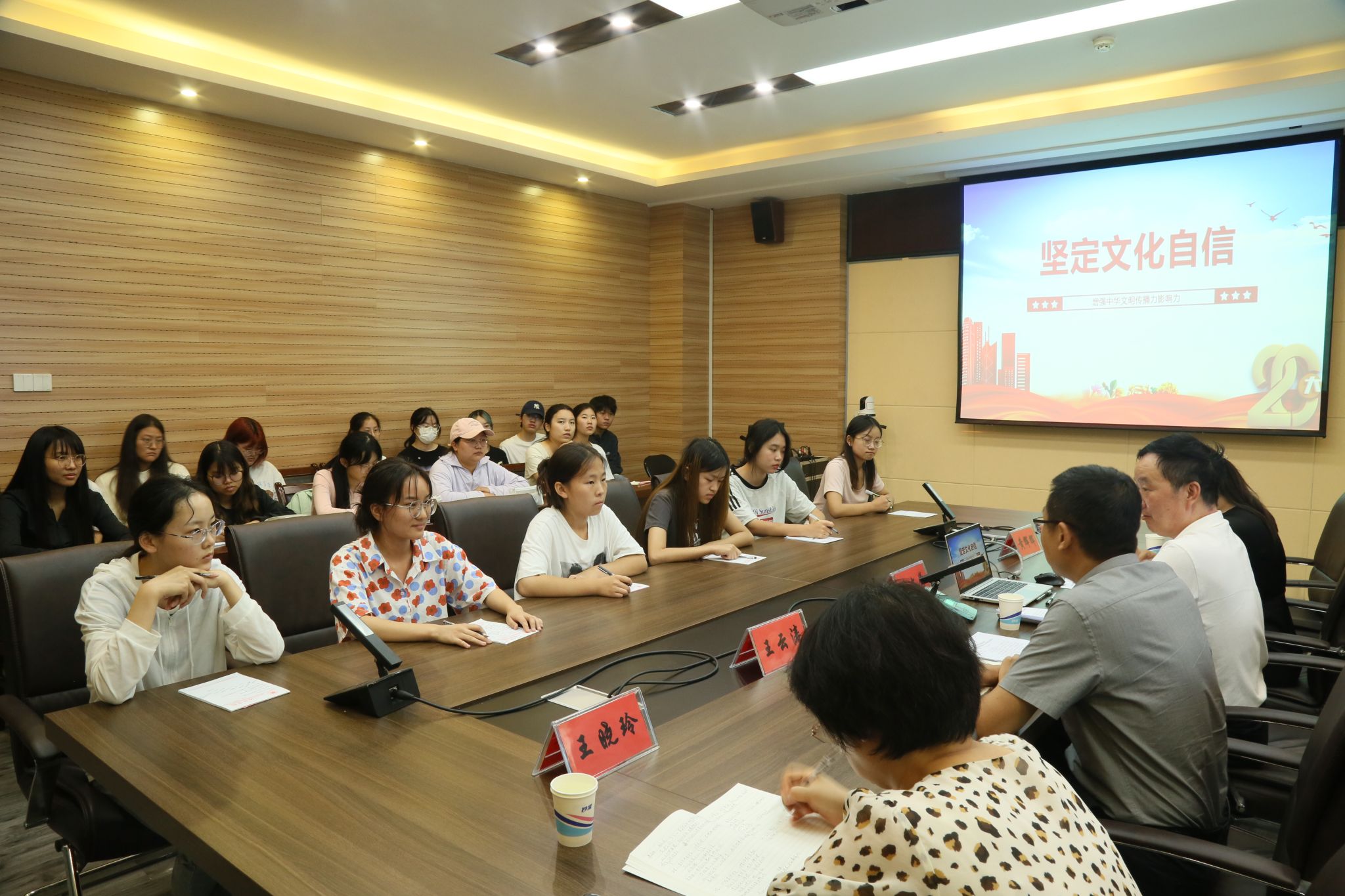 为深入学习贯彻习近平总书记对学校思政课建设重要指示精神,全面贯彻党的教育方针,提升思政课教学质量和育人实效,6月20日下午,副校长朱文学、档案馆副馆长王晓玲一行莅临性巴克 ,在5231会议室为联系班级讲授主题为“坚定文化自信 增强中华文明传播力影响力”的思政课,并组织召开联系班级学生座谈会和性巴克 领导班子座谈会。性巴克 领导班子、各科室主任、全体辅导员、英语2204班和2205班全体同学分别参加相关活动。活动由学院党委书记王云涛主持。