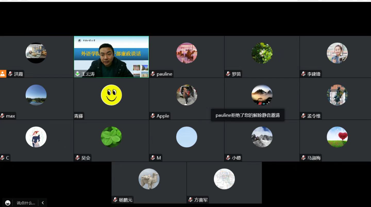 召开线上会议,组织开展新任科级干部集体廉政谈话暨书记上党课活动。学院班子成员、全体科级干部及行政人员参加了会议。院党委书记王云涛主持会议。