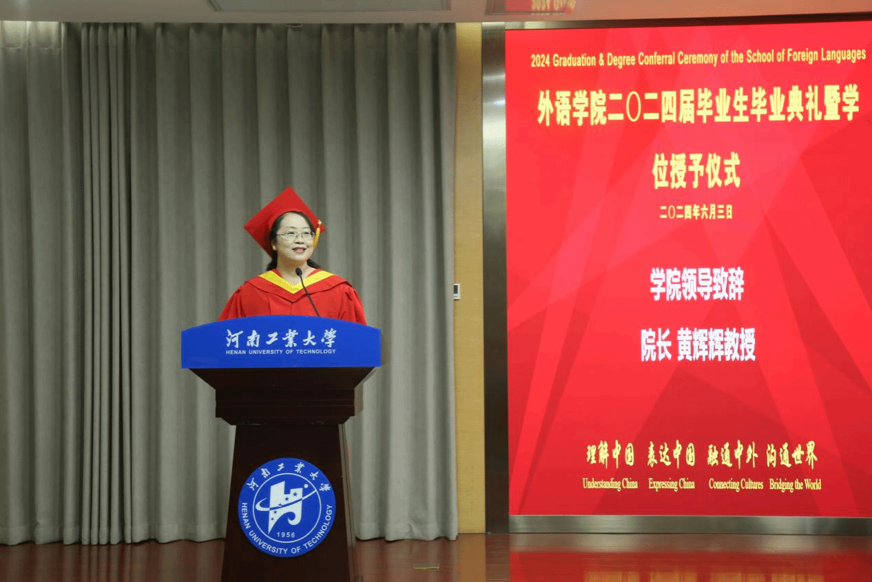 院长黄辉辉教授在典礼上对毕业生发表了深情的讲话,她如数家珍地回顾了2024届毕业生在学校留下的点滴美好,深情地代表学校向圆满完成学业、踏上人生新旅程的毕业生表示祝贺,并对毕业生深情寄语:一是内心向阳、眼中有光,要做向善、向阳、有趣、有容的人,要眼中有星辰大海,胸中有万千丘壑,心中有繁花似锦;二是要穿越迷雾、智中有光,希望毕业生珍惜人生的每一次体验,相信经历无数次雕刻与抛光后,终将开启智慧、熠熠生辉;三是要行而不辍、心中有光,希望作为新时代青年的同学们以伟大先贤为榜样,并要守住心中那束光,向光而行!