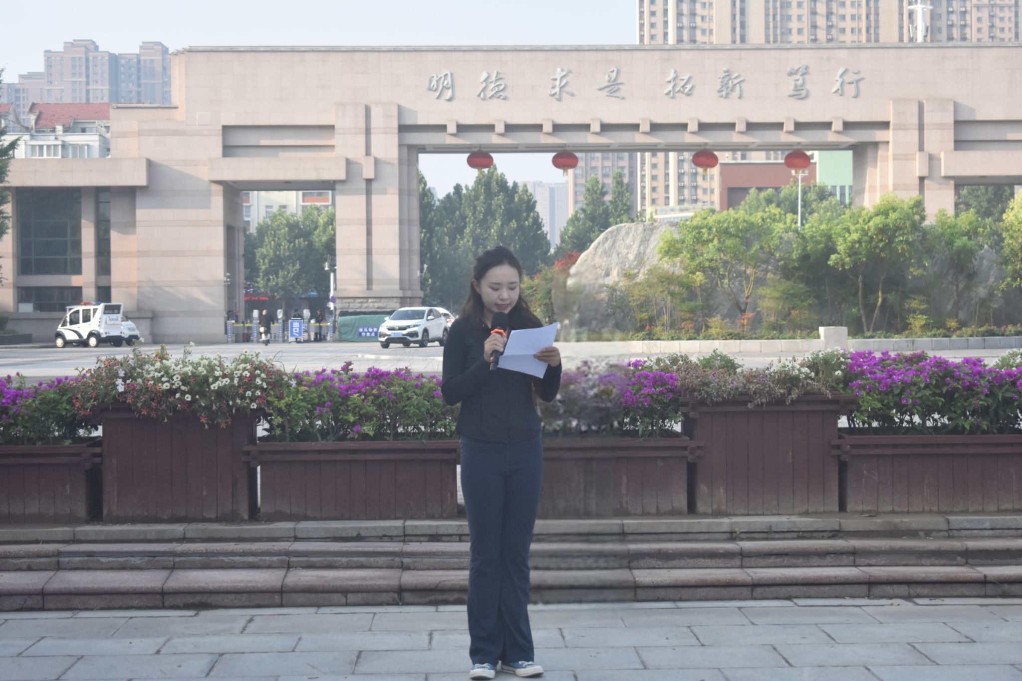 翻译2101班左雅茹同学作为学生代表发言,她以“爱我中华,生之浩瀚”为主题,慷慨激昂地表达了对祖国的热爱、对中华民族伟大复兴的坚定信念。“挚爱中国,放心有我”,她号召大家,用行动证明自己的爱国之心,用青春和热血为祖国的发展贡献力量。