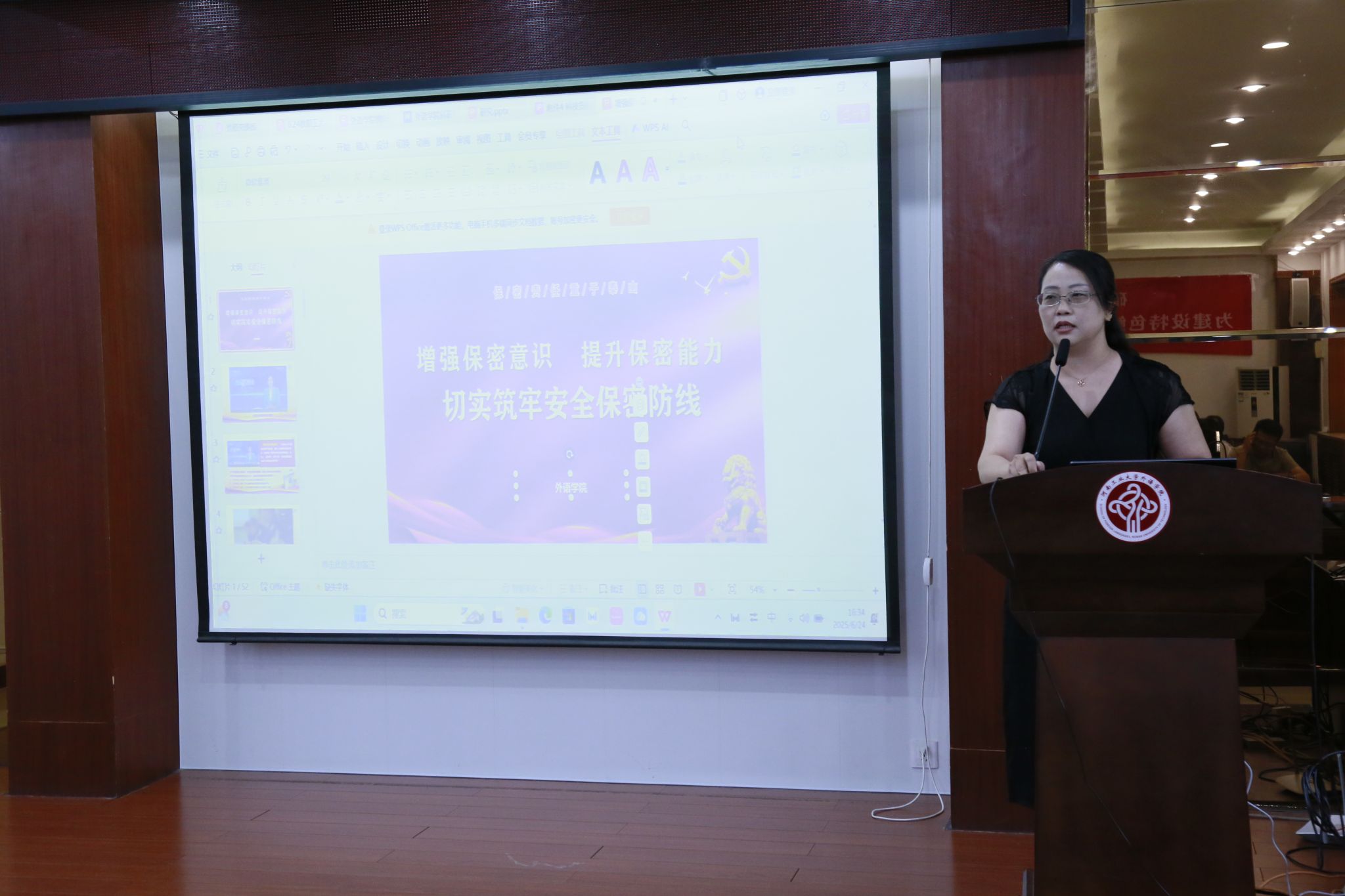 师生强化科研诚信意识,坚守学术底线;拓宽科研合作渠道,推动产学研深度融合;用好政策红利,提升科研创新水平。此外,黄辉辉特别介绍了学院重点建设的五个团队:“全球文学地理与跨文化互鉴研究创新团队”“数智时代外语教学范式转型与赋能研究团队”“粮食数字人文、翻译及国际传播导学创新团队”“语言认知与智能创新团队”“区域国别与跨文化研究创新团队”。她详细阐述了各团队的研究方向和发展规划,并热情邀请与会教师根据自身研究兴趣加入相应团队,共同推动学院科研水平再上新台阶。