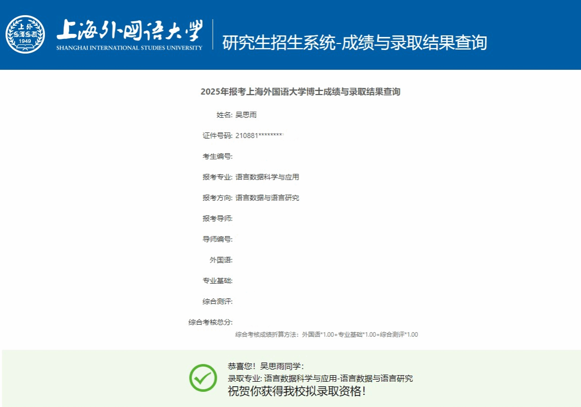 2025届硕士研究生吴思雨同学成功考取上海外国语大学语言科学研究院,语言数据科学与应用专业博士研究生,彰显性巴克
