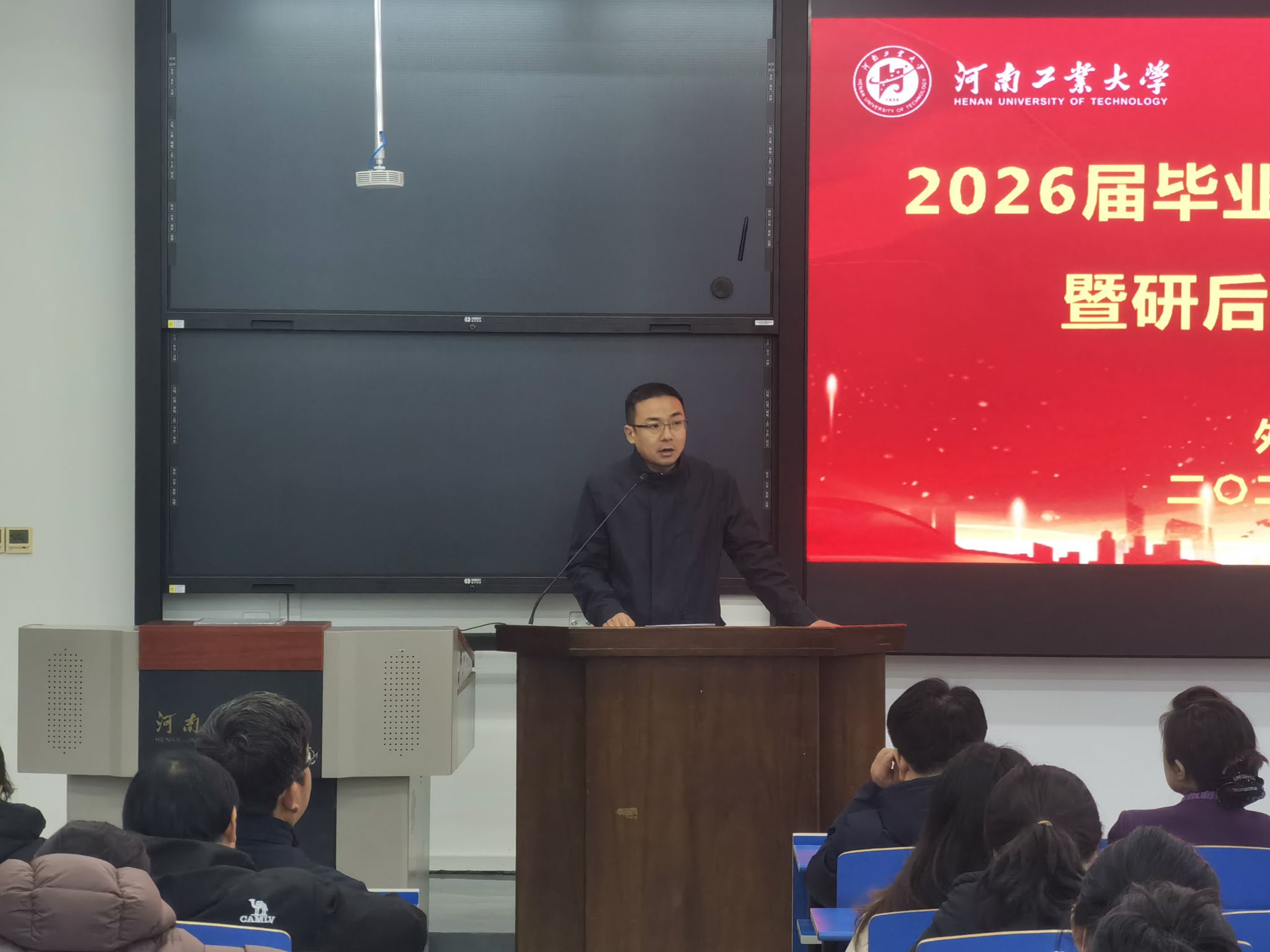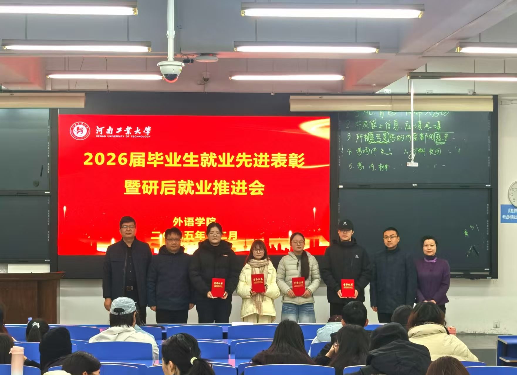 在4220教室举办2026届毕业生就业先进表彰暨就业推进会。学院党委书记王云涛、副书记王晓东、副院长葛丽萍、副院长沈国荣、毕业班辅导员郭珊珊及2026届全体毕业生参加会议。