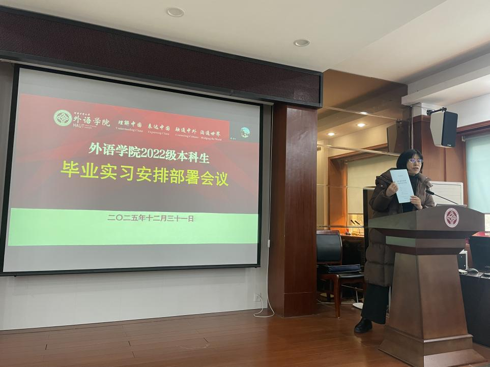 在5225会议室组织召开2026届毕业生实习动员大会。翻译系主任靳亚铭、英语系主任康方、教学办方喜军主任及全体2026届毕业生参加会议。会议采用线上线下相结合的方式进行。