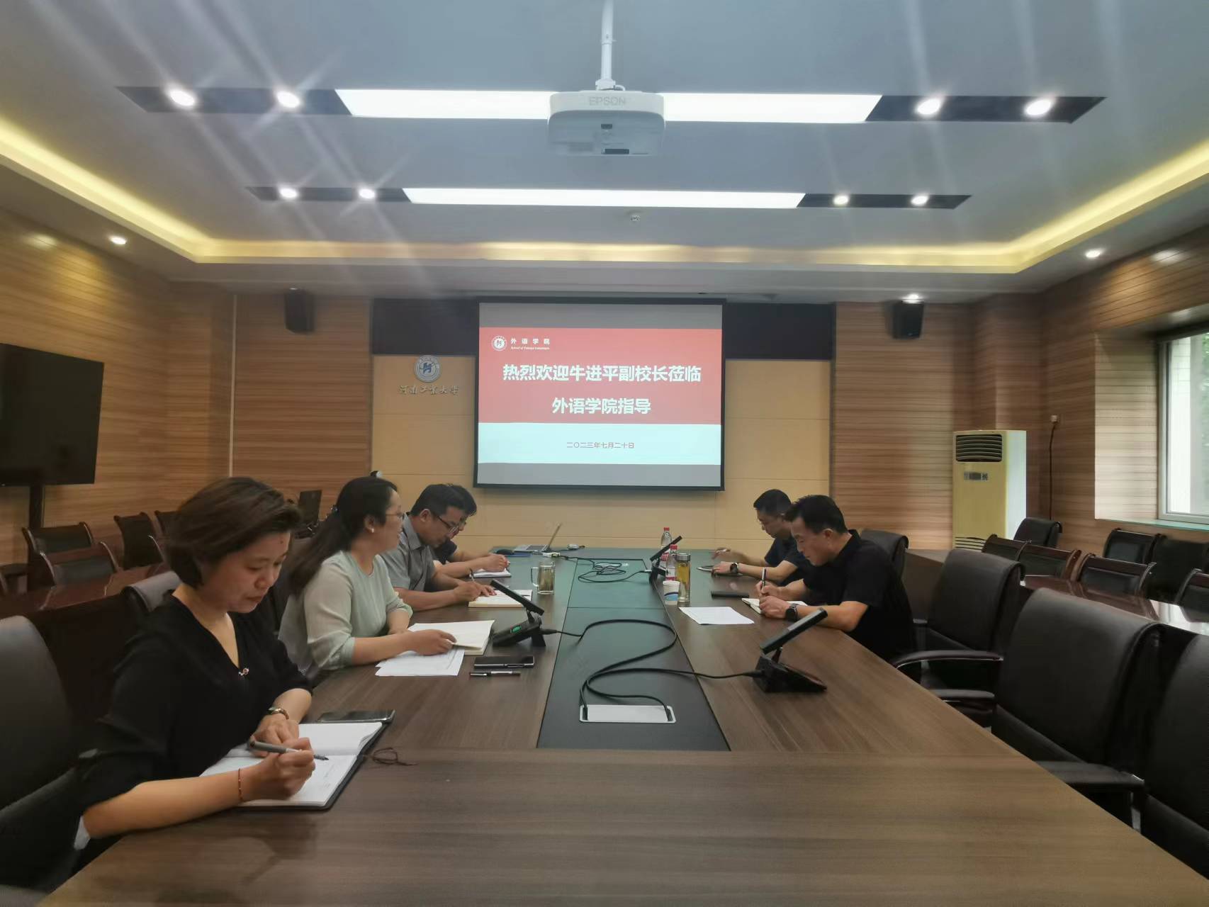 随后,院党委书记王云涛就党建工作、学生工作进行了详细汇报。他表示,学院坚持党建引领,有力推进主题教育和巡察整改落实各项工作,聚力学科专业和人才培养上层次、强特色、优声誉,发展势态良好。将继续发扬好传统、打造好班底、开拓好气象,推动学院发展迈上新台阶,为学校“双一流”创建贡献更多外语力量。