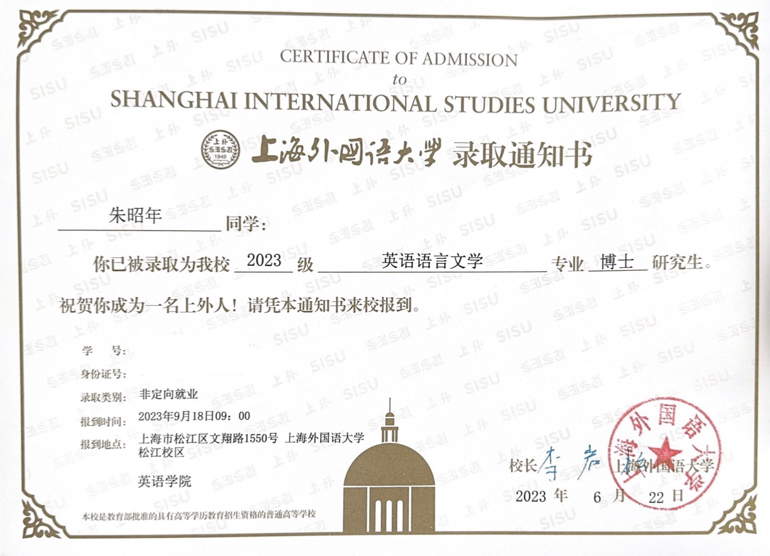 黄辉辉教授指导的2022届硕士研究生朱昭年同学成功考取上海外国语大学英语语言文学专业博士研究生。截止目前,学院共有5位应届及往届硕士研究生考取中国社会科学院大学、中央民族大学、郑州大学和美国中佛罗里达大学等国内外知名大学博士研究生。