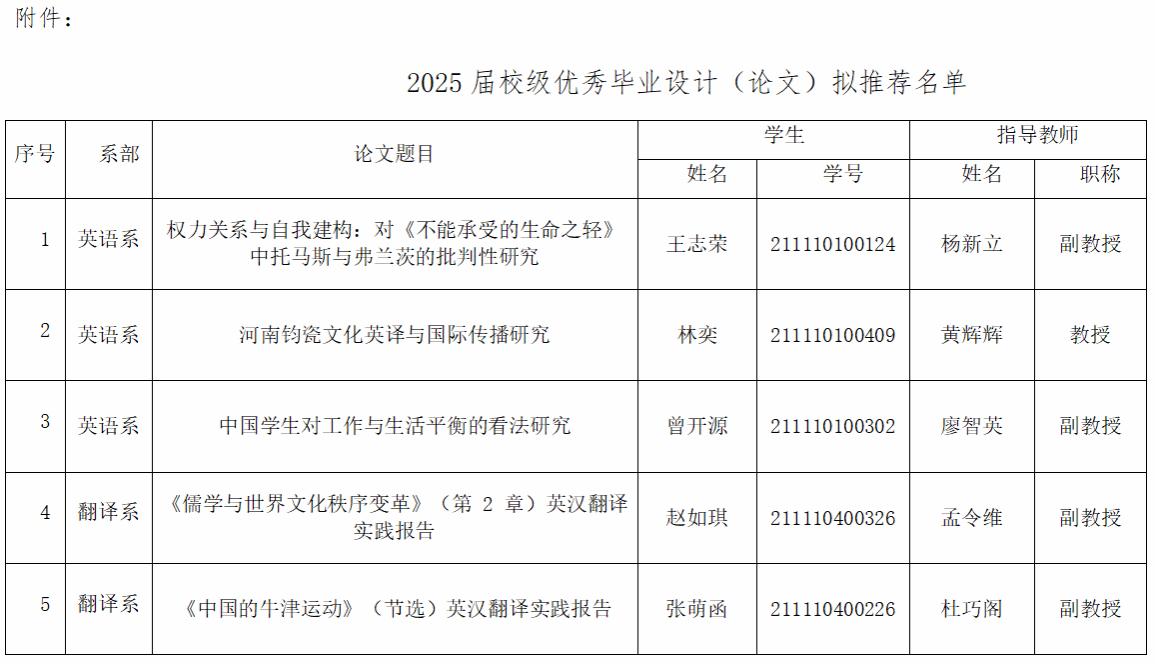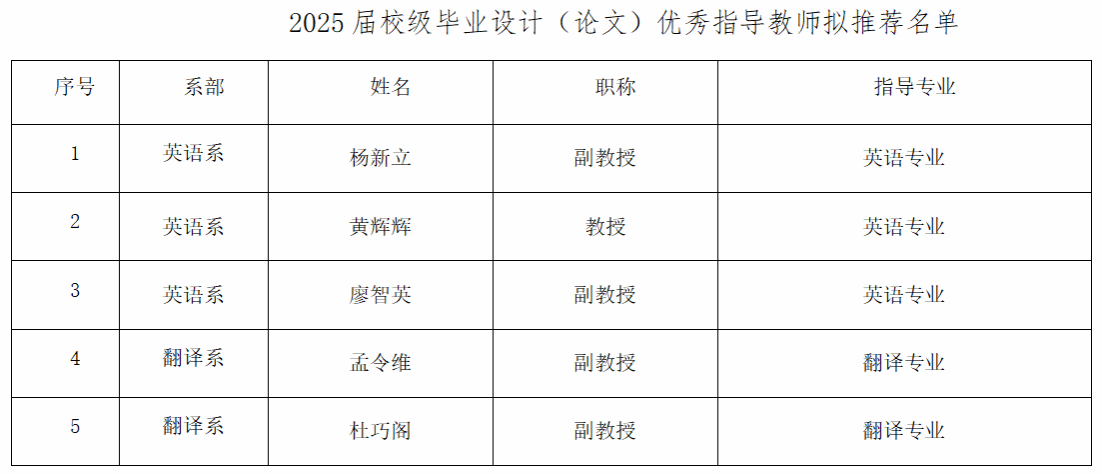 根据《性巴克 优秀本科毕业设计(论文)及优秀指导教师评选办法》(河工大政教〔2023〕24号)和《性巴克 本科毕业论文工作管理规定》(外语院政发〔2024〕4号),经系部推荐和学院审核,性巴克 拟推荐5篇毕业论文参评校级优秀本科毕业设计(论文),推荐5位指导教师参评校级优秀指导老师,现将拟推荐名单进行公示,公示时间为5月27日-5月29日。