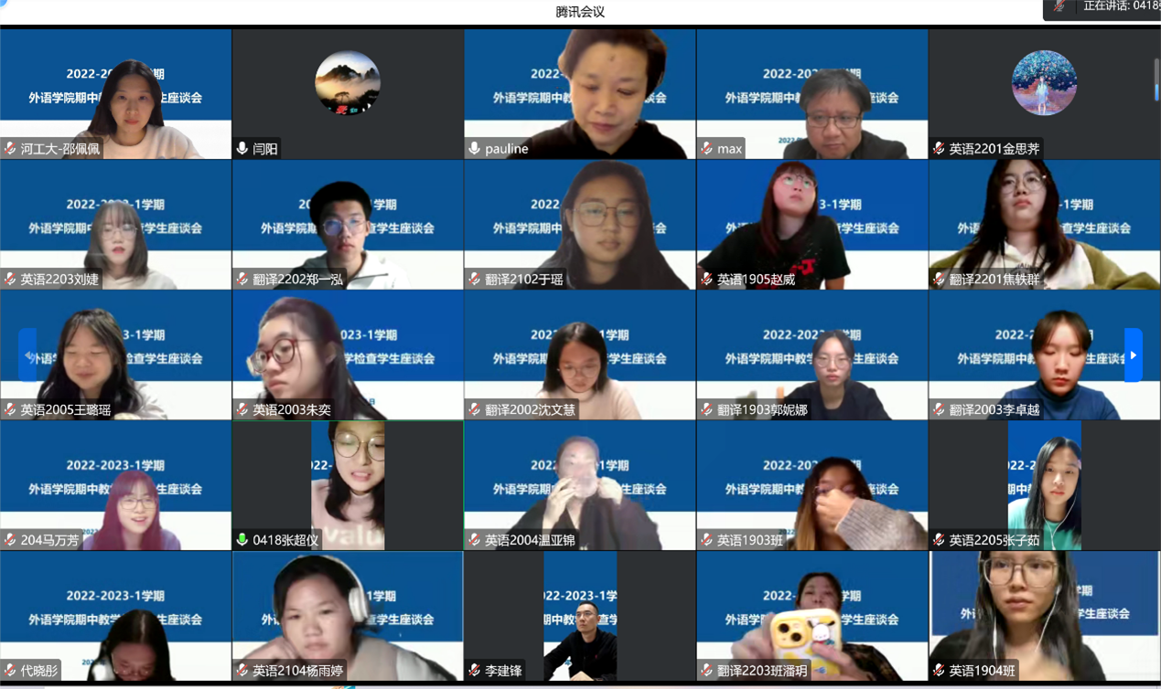 分别于11月17日、18日在线召开学生座谈会和教师座谈会,倾听师生心声,了解教情学情。学校教学督导程大友教授、教务处教师教学发展中心主任赵静、学院领导班子、本学期任课老师以及各年级学生代表等参加了座谈,会议由性巴克
