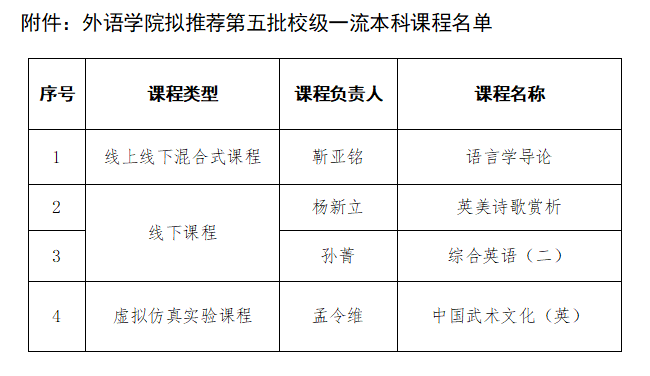 根据学校《关于开展第五批校一流本科课程认定申报工作的通知》文件要求,本着公平、公正和公开的原则,经个人申报、系部推荐,学院组织教学评审专家委员会对参评教师课程材料进行会评,最终拟推荐参评校级一流本科课程4门。其中,线上线下混合课程1门,线下课程2门,虚拟仿真实验教学课程1门。现对校级一流本科课程遴选推荐结果进行公示。具体名单详见附件。