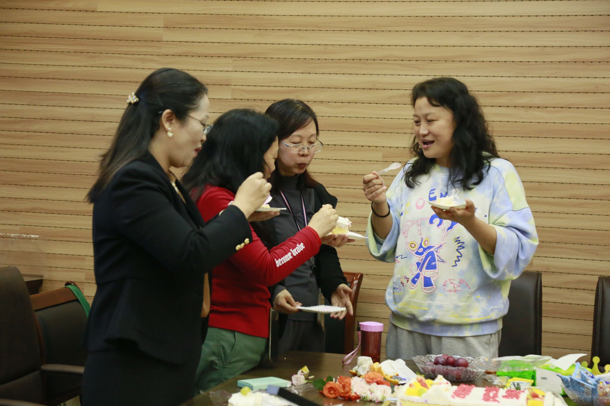 伴随着欢快的生日歌,与会领导、老师共同分享了精心制作的生日蛋糕,大家品尝着香甜的蛋糕,新鲜的水果,共同分享着生日的喜悦,活动现场轻松愉快,洋溢着愉悦的氛围。