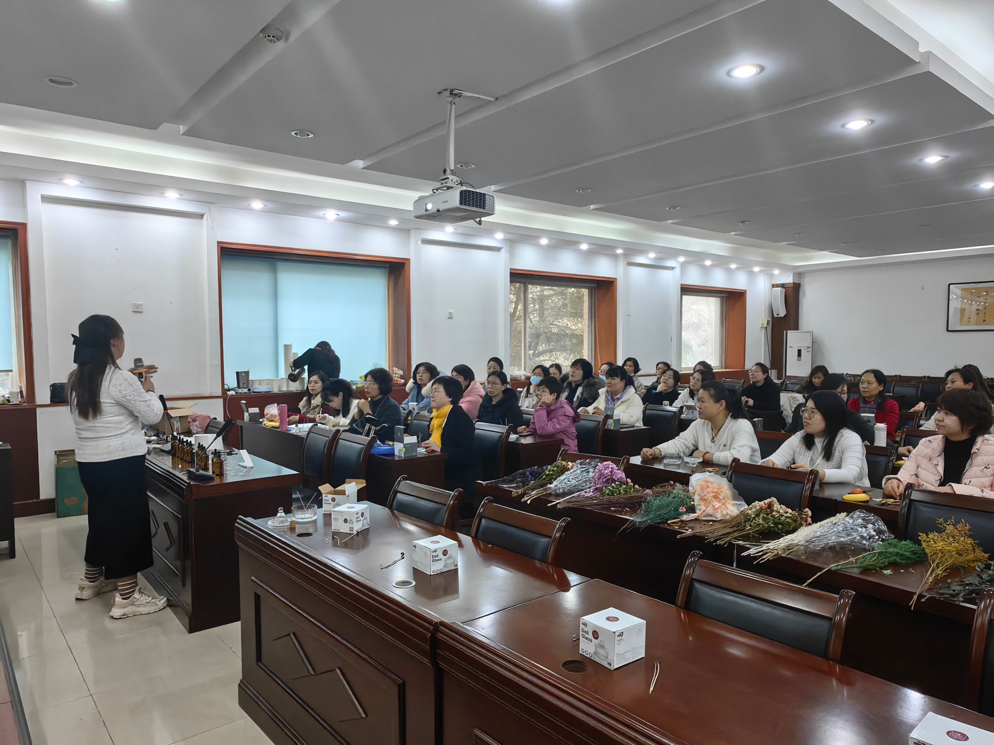 活动现场,水晶杯、干花等香薰制作材料整齐的摆放在桌面上,天然植物精油的清香弥漫开来,令人沉醉其中。待大家入座后,香薰制作师给教职工们讲解了香薰蜡烛的制作流程和注意事项,教职工在老师的细心指导下,学习了香薰蜡烛的制作步骤和技术要点,亲手挑选香料,将心仪的植物精油加入融化后的蜡液,用搅拌棒轻轻搅拌均匀,依兰、水蜜桃、红玫瑰、蝴蝶兰……各种花香顿时在房间里弥漫开来,将蜡液倒入玻璃水晶杯中,直至蜡液进入半凝固状态,再用干花进行点缀。