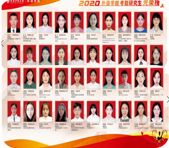 学院在校研究生41人,学硕已有12届毕业生,毕业人数125人。获批河南省研究生教育创新培养基地1个,《文化翻译》获河南省研究生优质课程。组织学生参加国内外学术会议、承担郑州国际少林武术节翻译志愿服务、以及中共中央对外联络部和中共河南省委共同主办的“习近平新时代中国特色社会主义思想在河南的实践”专题宣介会翻译任务,并被被评为全国“2019对外传播十大优秀案例”。近五年研究生发表学术论文150多篇,平均每生发表2-3篇;毕业研究生就业率100%,毕业流向多元化,分别为海外留学深造、考取国内博士研究生以及企事业单位就业。近年来4名研究生考取国内、国外名校博士研究生。
